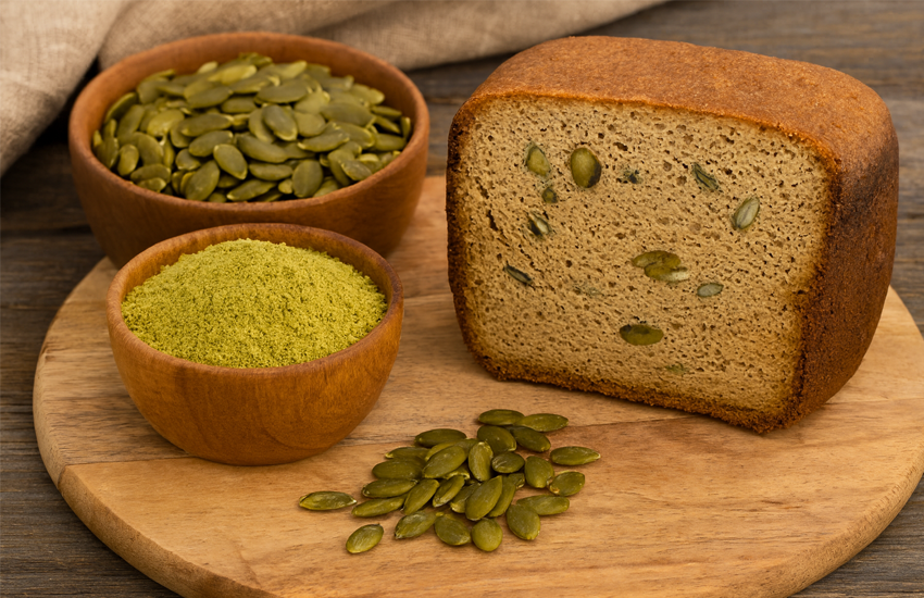 Gluten-free bread enriched with pumpkin seed flour gains not only a characteristic sweet flavor but also a beautiful golden color. Optimal proportions are 40% pumpkin seed flour, 30% rice flour, 20% potato starch, and 10% psyllium flour, which ensures the proper elasticity of the dough.